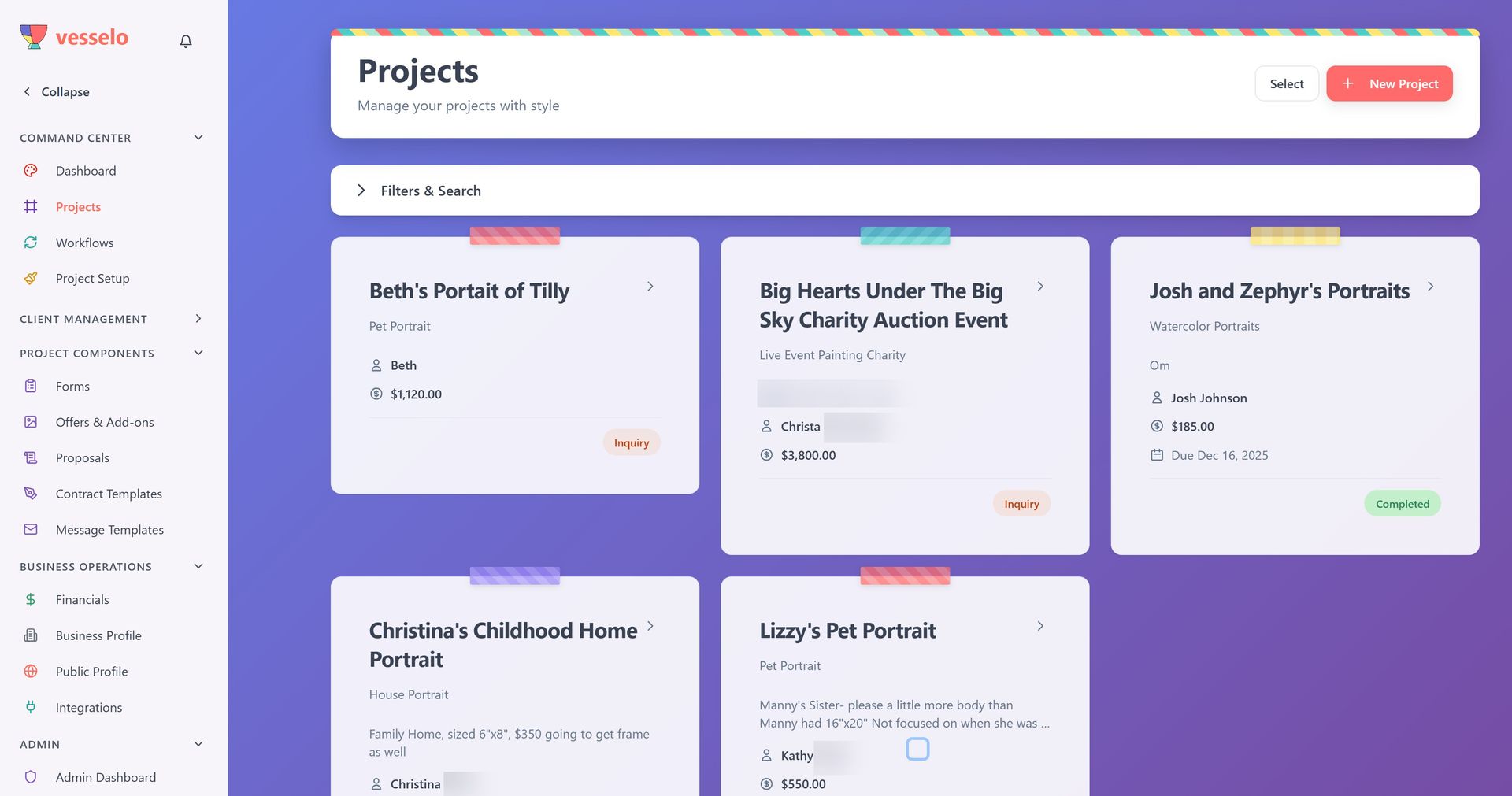 Instead of forcing your creative business into a box that doesn't quite fit, Vesselo is playful, visually pleasing, and makes your administrative work not only easy... but actually enjoyable.