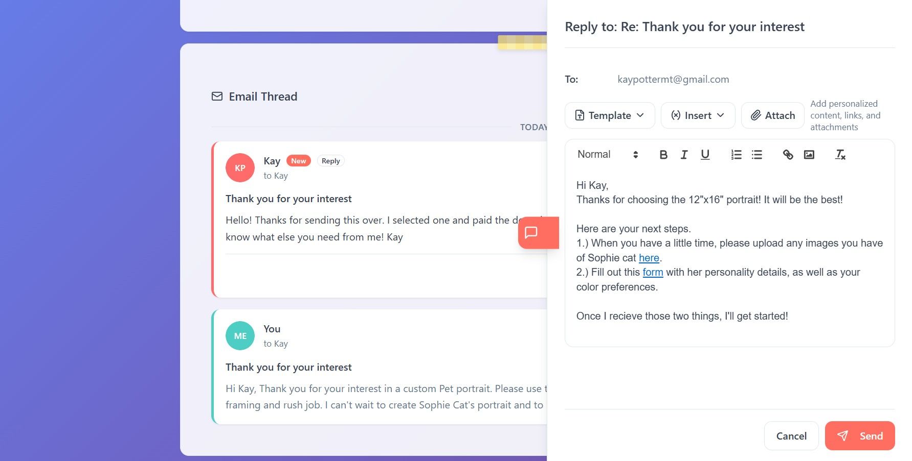 "Wow! This is a game changer for me as a pet portrait artist. Previously I had emails, photos, mockups and more in various places. Now it's all in the one place and I can stay super organised and find everything I need in one platform. This is such a time saver. The more I use it, the more I love it :)"